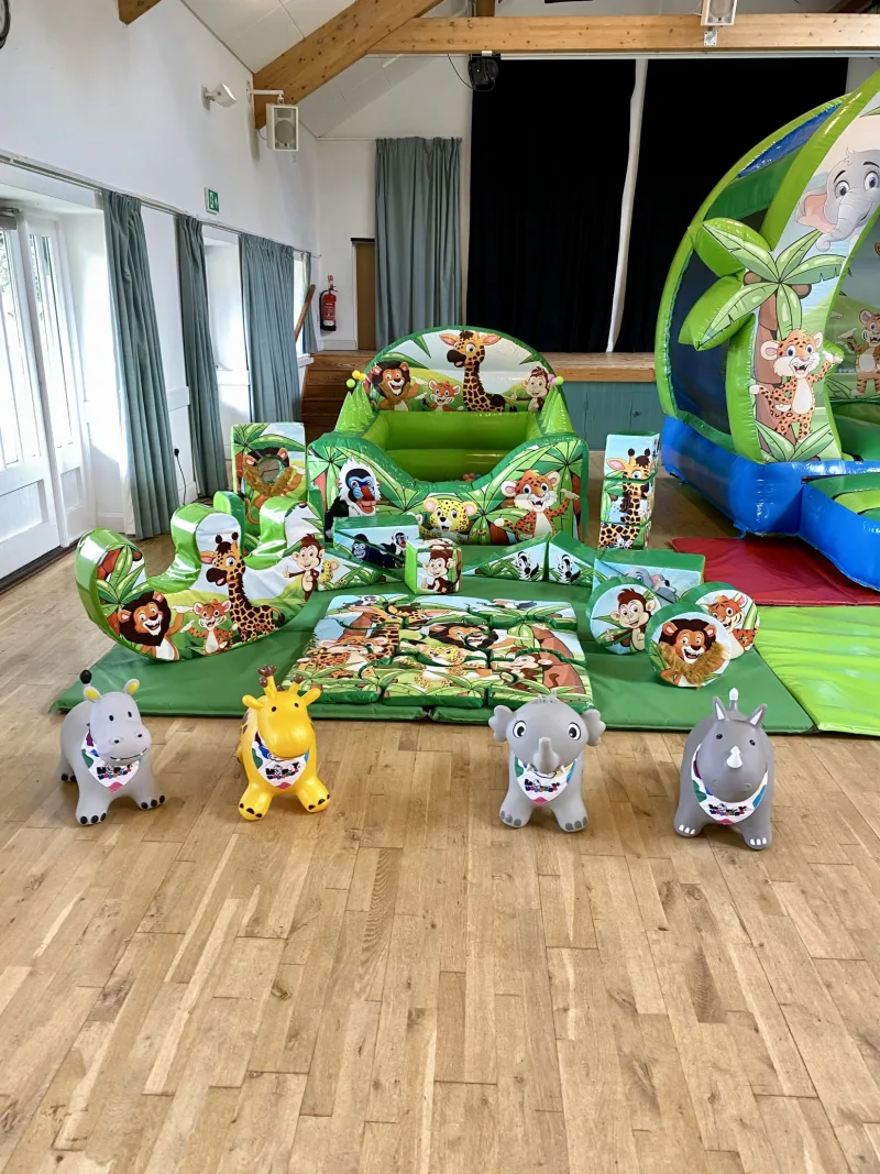 JUNGLE SENSORY BOUNCY CASTLE - with added sensory features, Ruffle the Lions mane, Poke the Tiger, Stroke the Giraffe, Tickle the Monkey, Feel the wind - specially designed flap, when open a gentle breeze can be felt.
